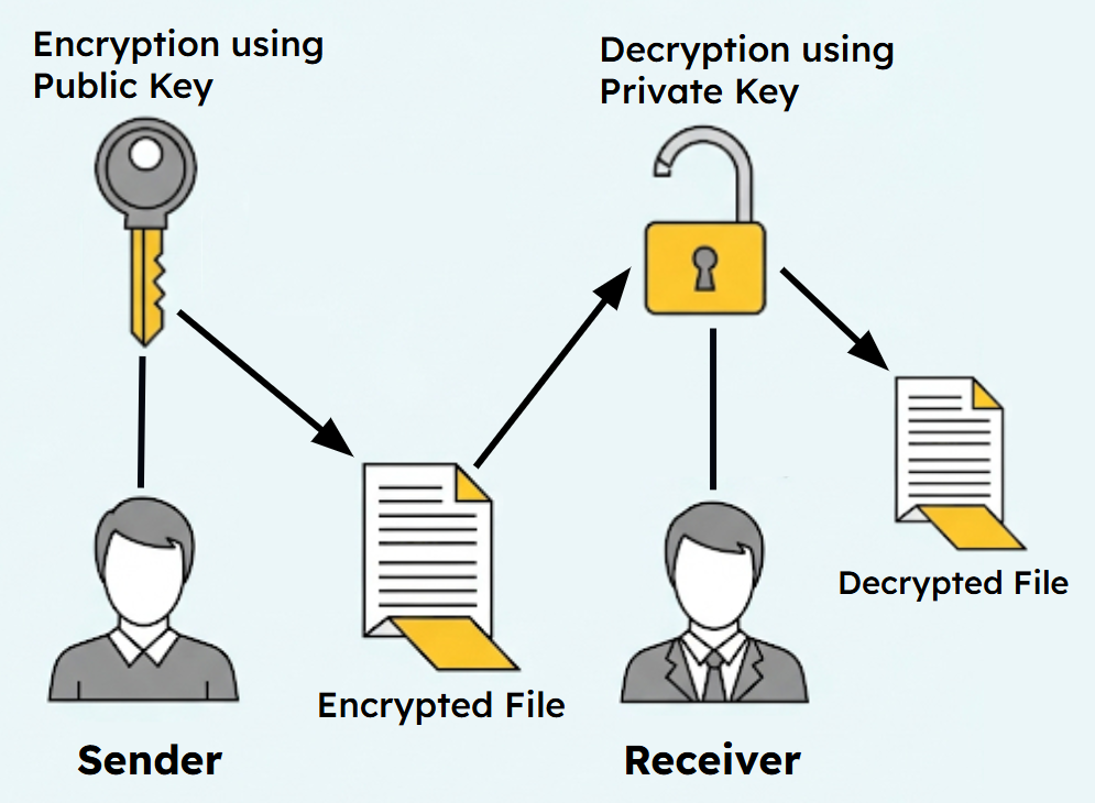 Consider a practical scenario: you want to send sensitive financial documents to your accountant. Your accountant generates a key pair and emails you their public key (this email doesn't need to be secure since public keys are meant to be shared). You use their public key to encrypt your financial documents. Even if someone intercepts the encrypted files during email transmission, they can't read the contents because only your accountant's private key can decrypt them.